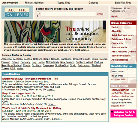All The Galleries combines a bespoke CMS along with sophisticated search and emailing facilities for its site visitors. It also corporates intelligent automated ad placement based on page content.